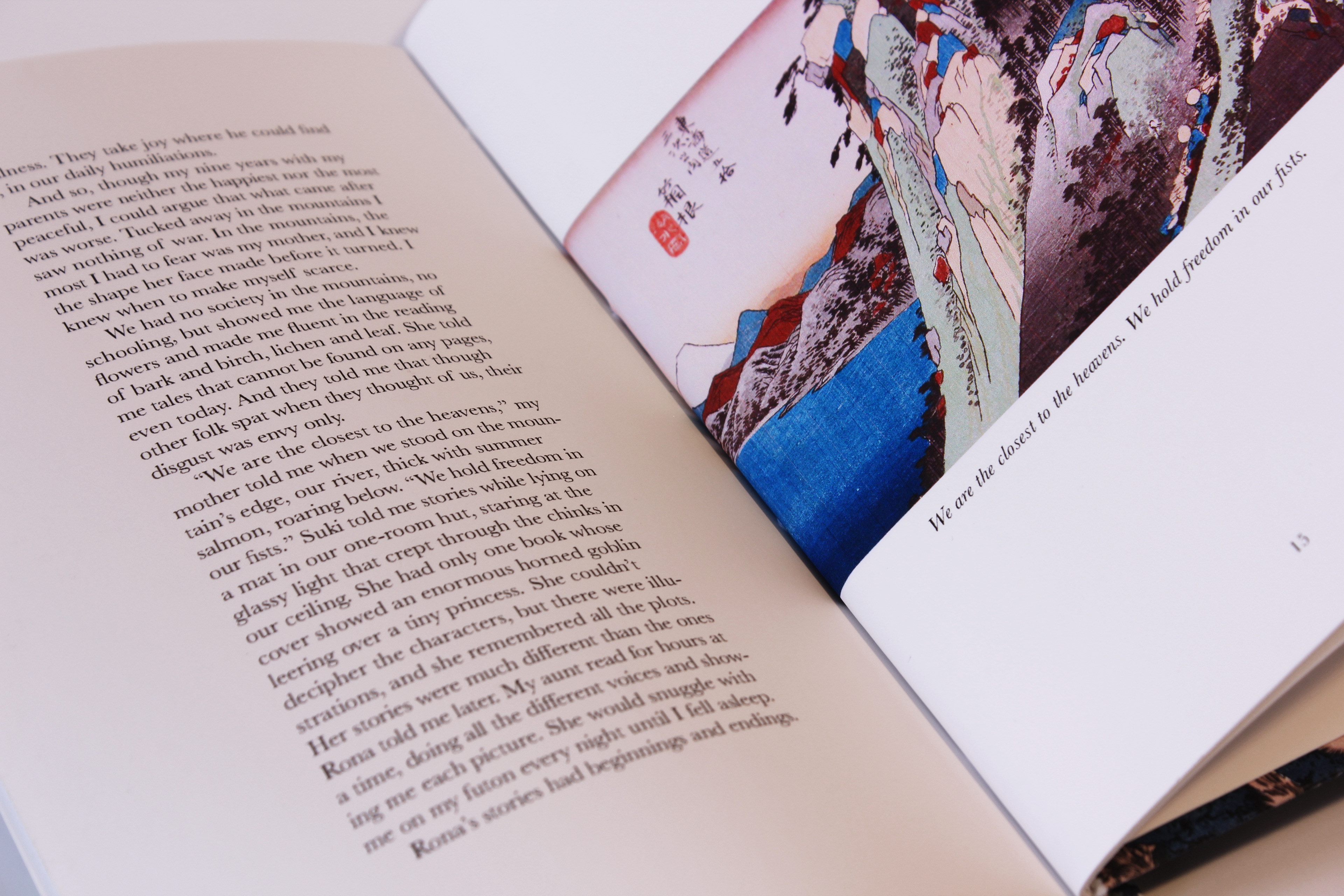 The story takes place high in a mountain village but near the sea. For the cover, I created a digital collage of prints from Hokusai’s famous 36 Views of Mount Fuji. From craggy mountain passes shrouded in fog to the fishing boats tossed on stormy seas, I wanted to capture the spirit of this place. The images on the cover are balanced with more Japanese Ukiyo-e woodblock prints within. These plates illustrating the dramatic mountain and ocean scenes are from Hiroshige.